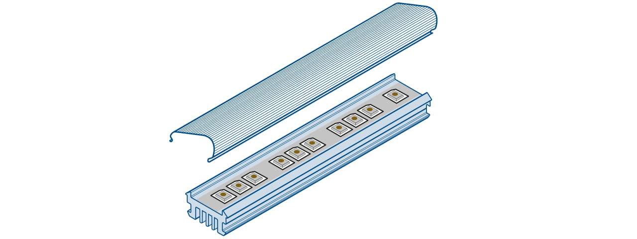 En las luces LED construidas en filas, los chips LED se colocan en placas de circuito. Estas tiras de LED están montadas en un disipador de calor para disipar el calor objetivo de manera efectiva. Habitualmente, un perfil de sujeción de disipadores de calor se produce a partir de aluminio, sin embargo, en muchos casos los perfiles de plástico pueden reemplazar a los de aluminio, ya que los chips LED tienen una emisión de calor comparativamente baja, así como la ventaja de la reducción de peso y de los costos del ciclo de vida.