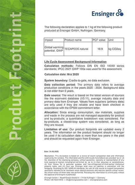 Uhlíková stopa výrobku (PCF) polotovaru TECAPEEK natural.