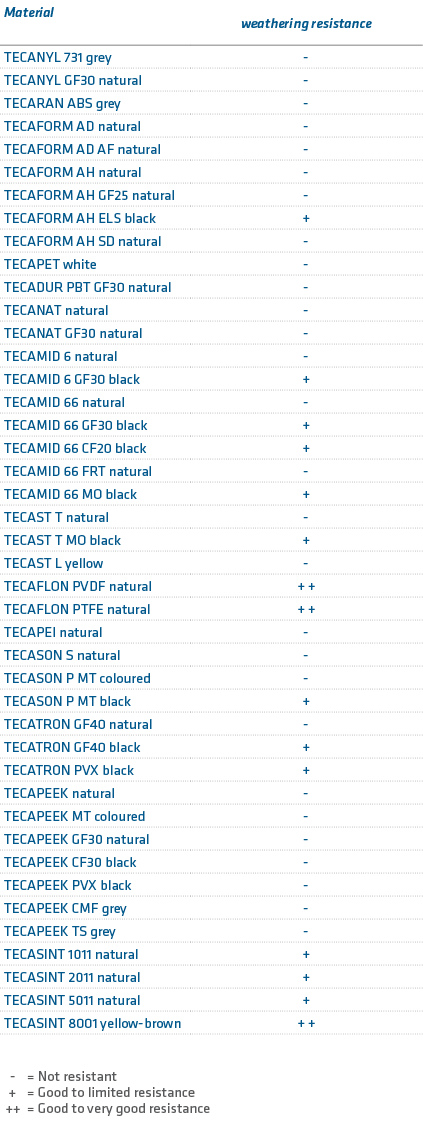Det er normalt en god idé, at plastmaterialer, som skal være vejrbestandige, er rimelig UV bestandige, fordi UV stråling kan have stor indvirkning på materialer, der anvendes og udsættes for vejrlig.