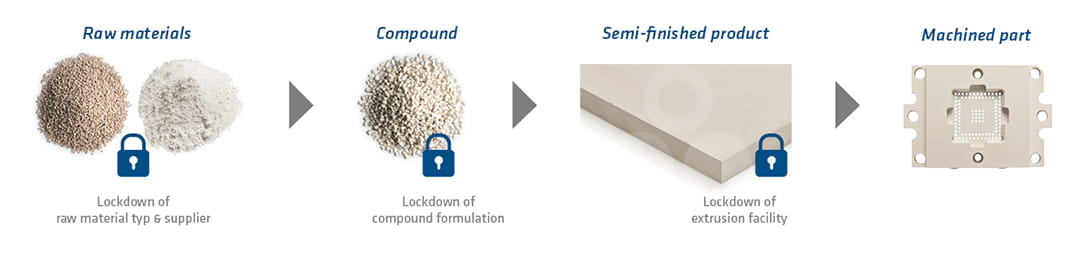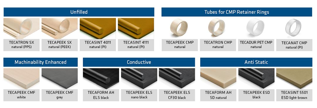 Ensinger bietet ein breites Spektrum an technischen und Hochleistungskunststoff-Halbzeugen für Halbleiter- und Elektronikfertigungsteile. Alle Kunststoffe für die Halbleiterindustrie werden unter Einhaltung der copy exactly Anforderungen (auch bekannt als copy exact oder CE) und strengen Kontaminations- und Qualitätskontrollen verarbeitet, um ein Höchstmaß an Reinheit und gleichbleibender Qualität zu gewährleisten. Darüber hinaus sorgen spezielle Maßnahmen während der Produktion für geringe innere Spannungen und verbesserte Dimensionsstabilität bei der Bearbeitung.