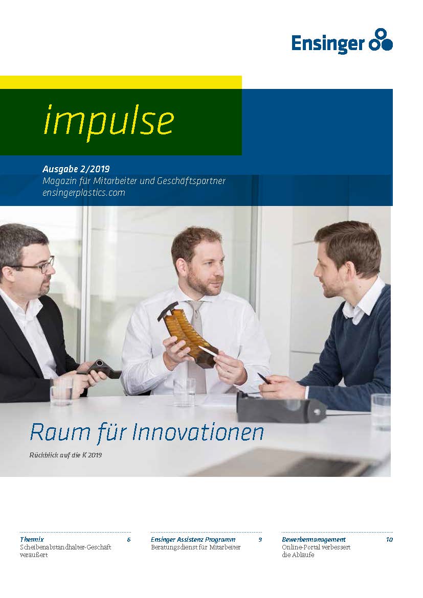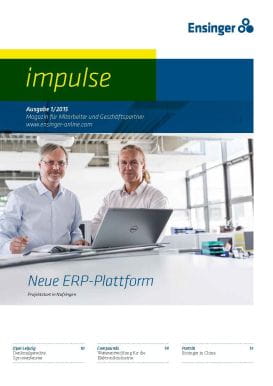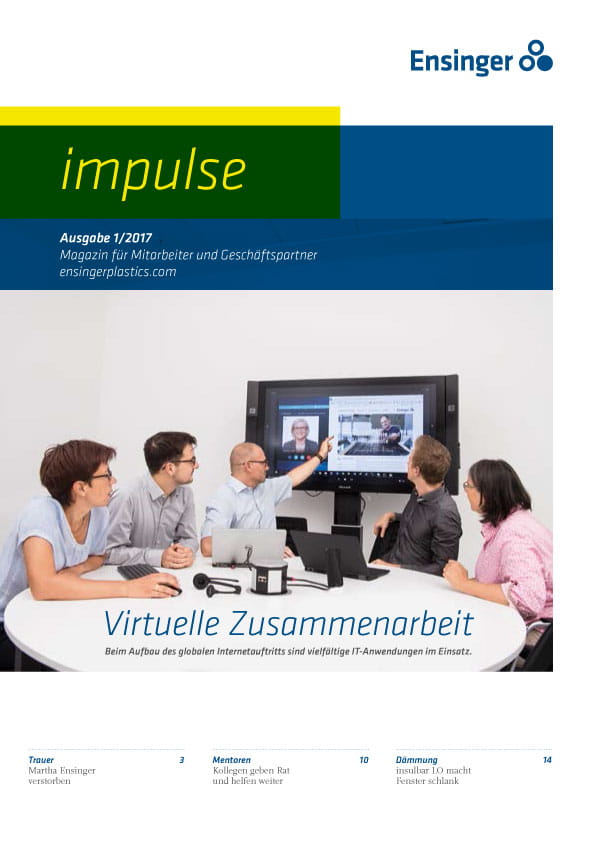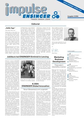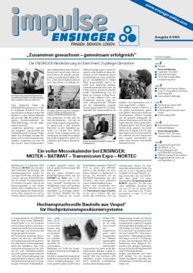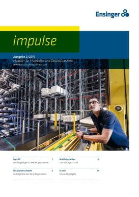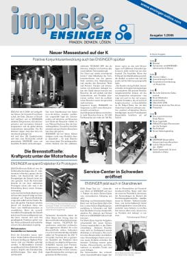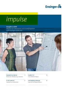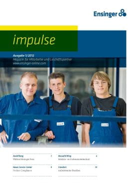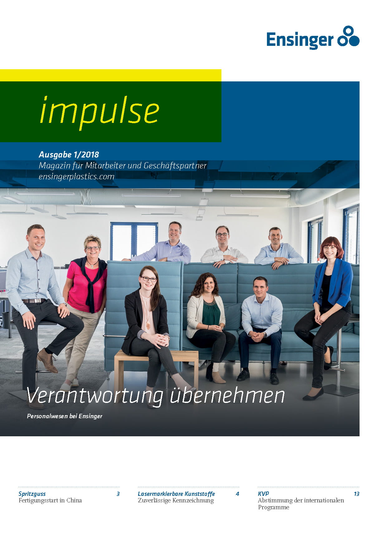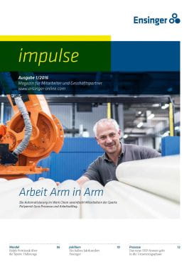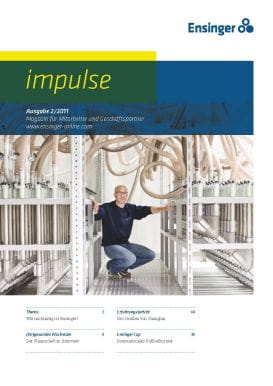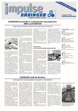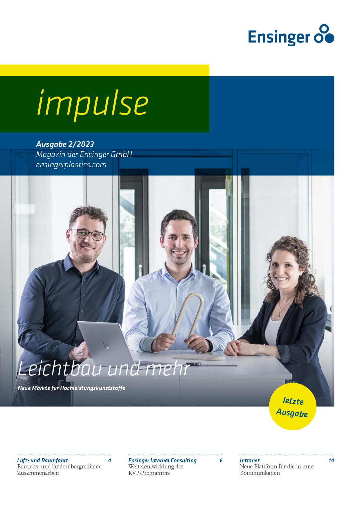 Wissenswertes über Produkte und technische Anwendungen sowie Persönlichkeiten, die das Unternehmen Ensinger prägen und gestalten. Über diese Themen berichtete die Mitarbeiter- und Kundenzeitschrift "impulse" von 1999 bis 2023 in deutscher und englischer Sprache. Alle seit 2002 erschienenen Ausgaben können in der untenstehenden Übersicht als pdf-Dokument heruntergeladen werden.