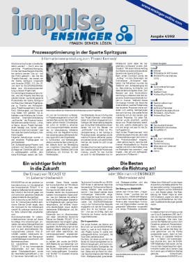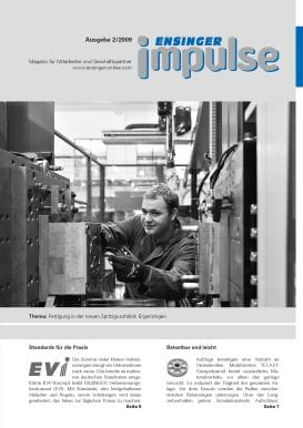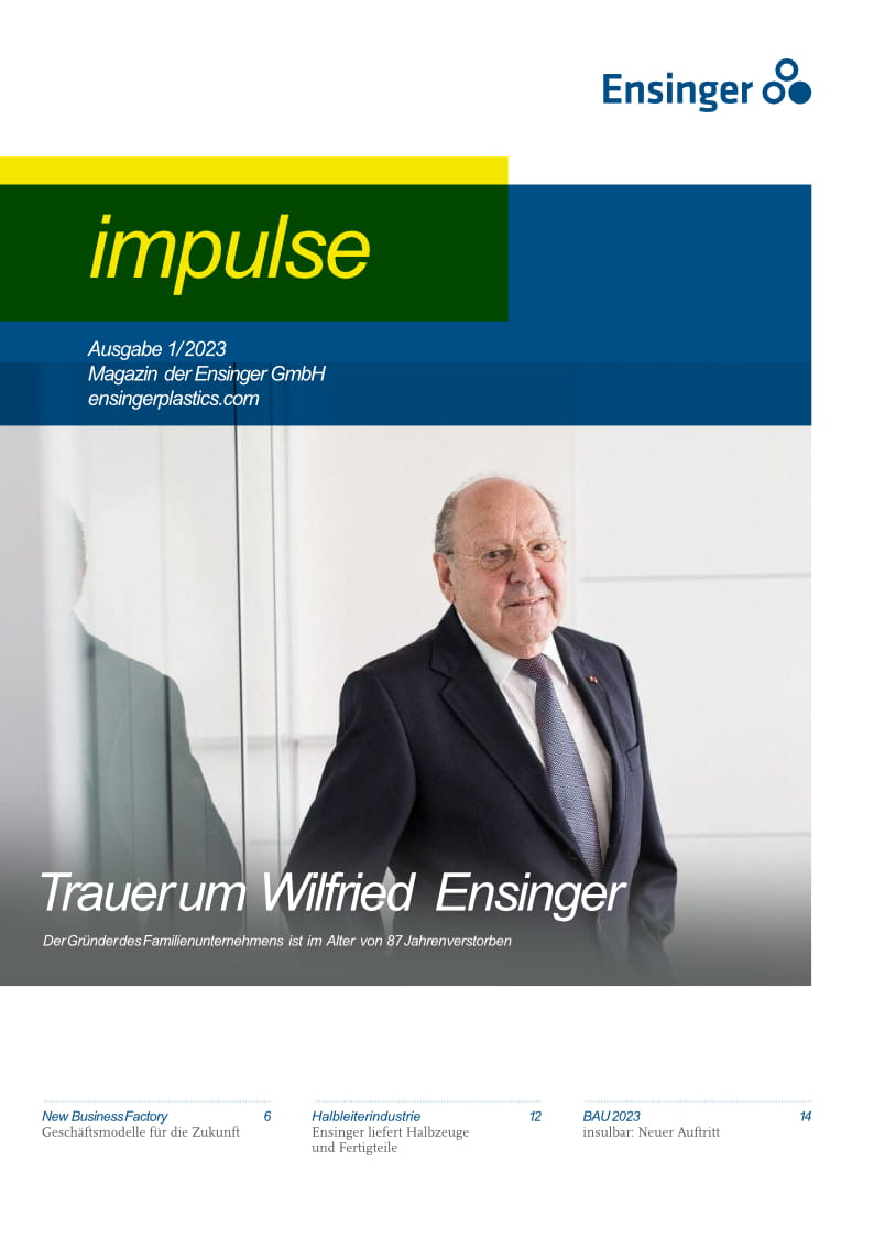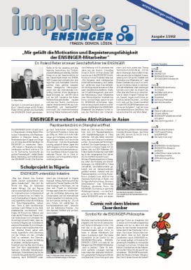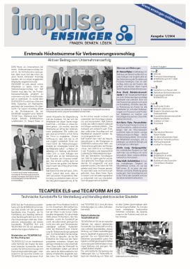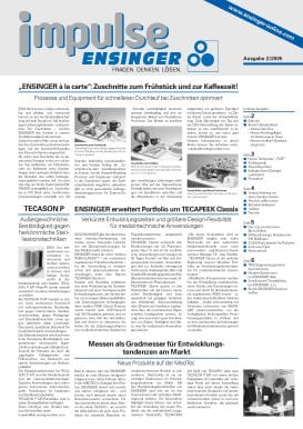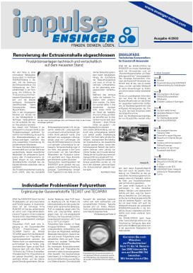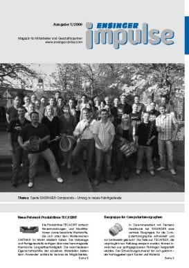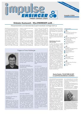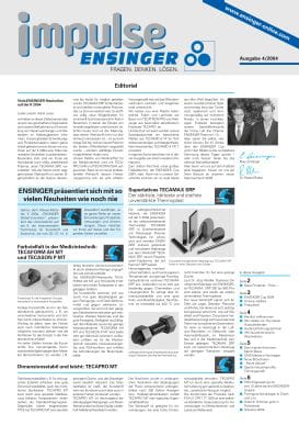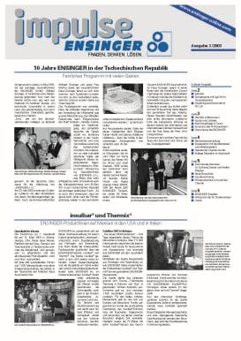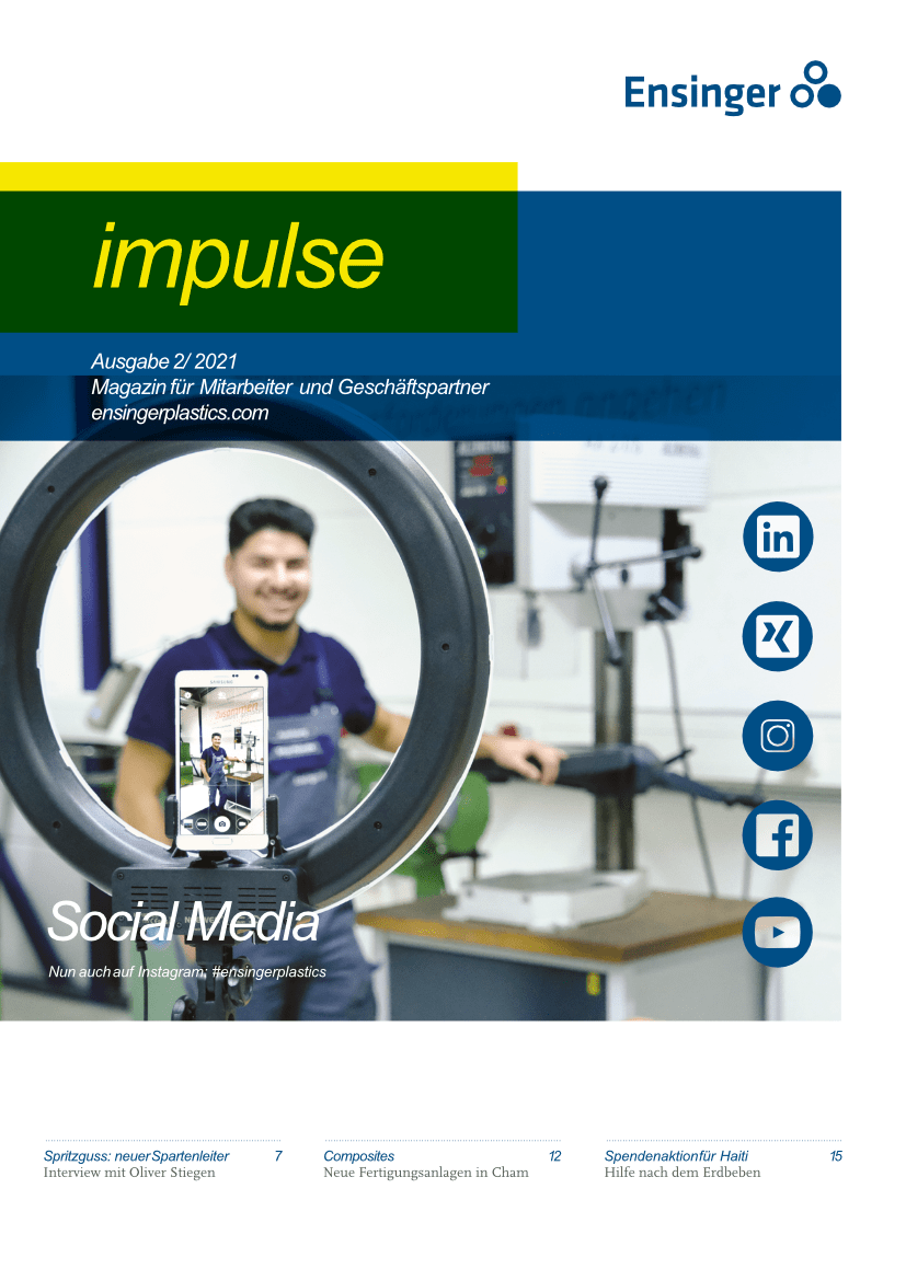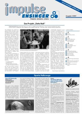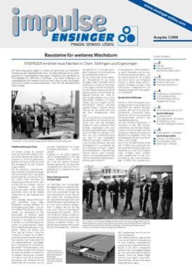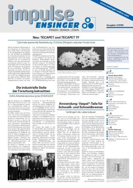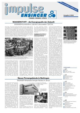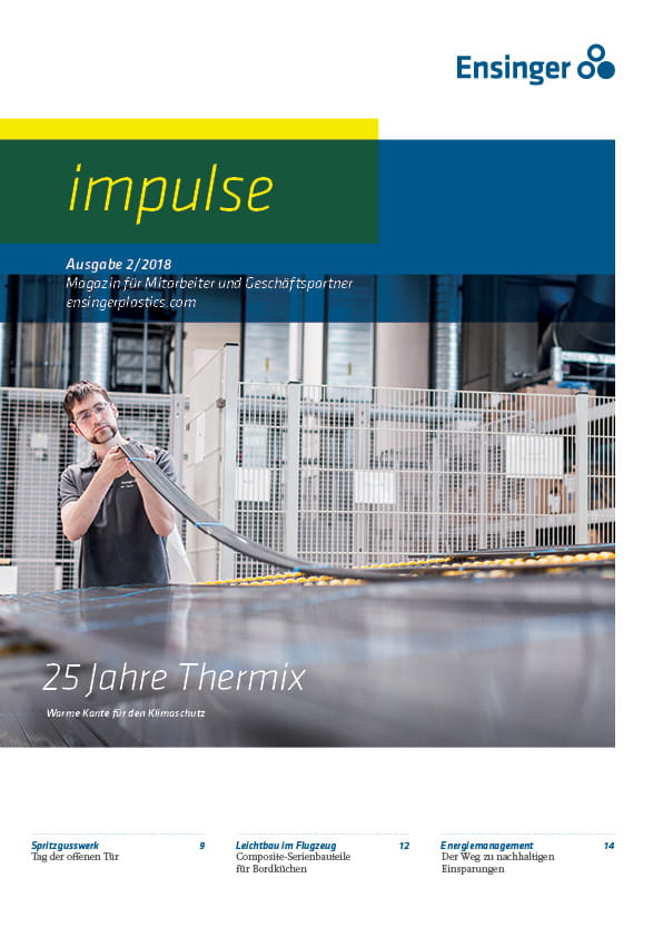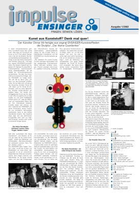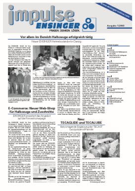 Wissenswertes über Produkte und technische Anwendungen sowie Persönlichkeiten, die das Unternehmen Ensinger prägen und gestalten. Über diese Themen berichtete die Mitarbeiter- und Kundenzeitschrift "impulse" von 1999 bis 2023 in deutscher und englischer Sprache. Alle seit 2002 erschienenen Ausgaben können in der untenstehenden Übersicht als pdf-Dokument heruntergeladen werden.