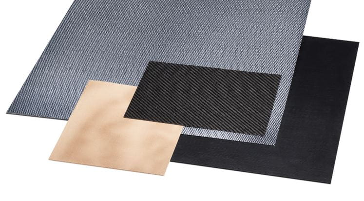 Thermoplastische Organobleche von Ensinger. Die mehrlagigen, vollständig imprägnierten und konsolidierten Faserverbundwerkstoffe werden aus Kohlenstoff- oder Glasfasergeweben und vielfältigen Matrixmaterialien hergestellt. Die Organobleche bestehen aus mehreren Lagen Prepreg- oder Semipreg-Material, die nach Kundenspezifikation aufgeschichtet und dann zu einem Zuschnitt mit einer Dicke von bis zu 5 mm gepresst werden. (Foto: © Ensinger)
