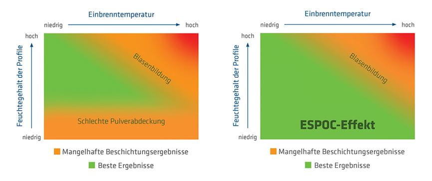 Unabhängig vom Feuchtegehalt der mit ESPOC behandelten Profile bleibt die Anziehung des Pulvers während des Beschichtungsprozesses auf einem konstant hohen Niveau. Dadurch kann auch bei trockenen Profilen ein optimales Beschichtungsergebnis erzielt und der sogenannte „Blistering-Effekt“ (Blasenbildung im Beschichtungsprozess) eliminiert werden (Abbildung: Ensinger)