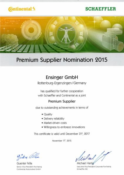 Die Automobilzulieferer Schaeffler und Continental haben die Spritzguss-Sparte von Ensinger zum dritten Mal in Folge als „Premiumlieferant“ ausgezeichnet. Insgesamt haben 37 internationale Unternehmen diesen Status erhalten. Für die Lieferanten bietet die Aufnahme in den „Premium Supplier Circle“ den Vorteil, dass sie frühzeitig in Produktentwicklungsprojekte eingebunden werden.