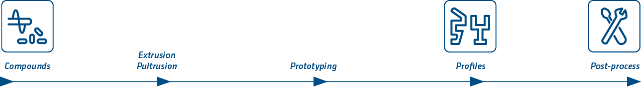 Unsere hochqualifizierten Experten beraten Sie umfassend und begleiten Ihr Projekt in jeder Phase der Entwicklung. Wir verwenden und entwickeln Verarbeitungsverfahren wie Extrusion, Coextrusion und thermoplastische Pultrusion und begleiten Ihr Projekt von der Prototypenentwicklung bis zur Serienfertigung.