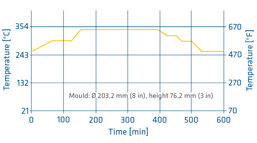 Die Berechnung der Sinterzeit (Verweilzeit) sollte etwa 1,5 Stunden/2,5 cm (1 in) Wanddicke betragen.