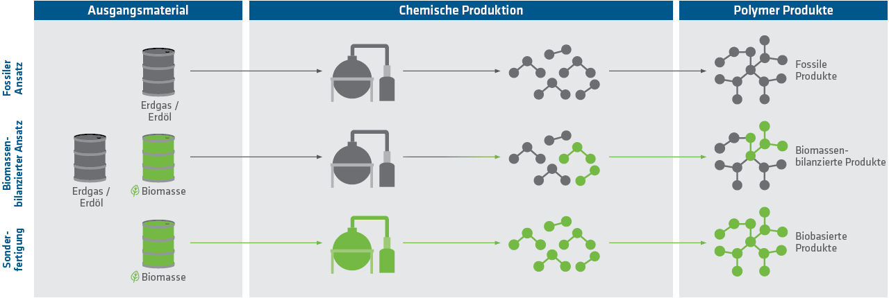 Unter "biobasiert" versteht man die Verwendung von organischen Rohstoffen, die z. B. aus Küchen- oder Landwirtschaftsabfällen, aus Rückständen der Holzindustrie oder aus nachwachsenden Rohstoffen gewonnen werden. Durch einen chemischen Prozess werden diese Materialien in biobasierte Monomere umgewandelt, die anschließend mit fossilen Monomeren gemischt und durch dieselben chemischen Reaktionen zu Polymeren verarbeitet werden wie reine fossile Produkte. Das resultierende Gemisch, das sowohl biologische als auch fossile Monomere enthält, wird als "biomassebilanziert" bezeichnet.