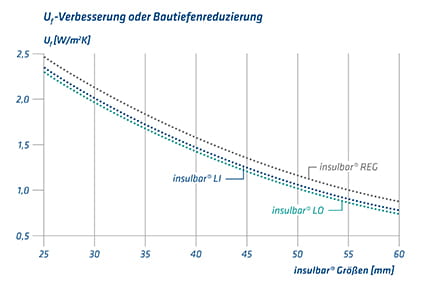 Abhängig vom Ausgangssystem lassen sich durch die Umstellung auf insulbar LI die Uf-Werte um etwa 0,1 W/m2K reduzieren. Bestehende Fenstersysteme können so durch einen Wechsel zu insulbar LI wärmetechnisch einfach verbessert bzw. in zusätzlichen Varianten mit unterschiedlichen Uf-Werten angeboten werden – ohne weitere System- oder Prozessveränderung.