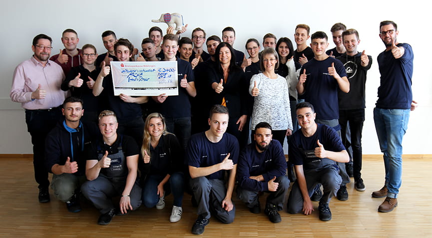 Spendenübergabe bei Ensinger in Nufringen: Die Auszubildenden und Vertreter des HR-Teams mit Sandra Stopper, die den Scheck für „Arche IntensivKinder“ entgegennahm.