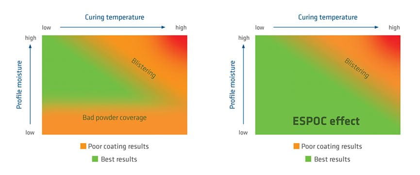 Regardless of the moisture content of the profiles treated with ESPOC, the attraction of the powder remains at a constantly high level during the coating process. An optimum coating result can be achieved even with dry profiles and the "blistering effect" (formation of bubbles in the coating process) can be eliminated (Chart: Ensinger)