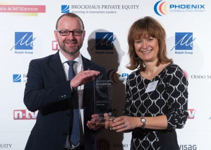 Frank Killinger (Head of Sales) and Marnie Röder (Head of Marketing) at the award ceremony in Frankfurt (Photo: n-tv/Andreas Mann).