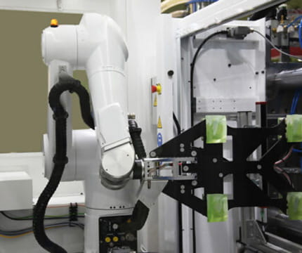 At Ensinger, our second cobot is used in insert molding. It places the inserts into the injection molding machine, then removes the finished parts.