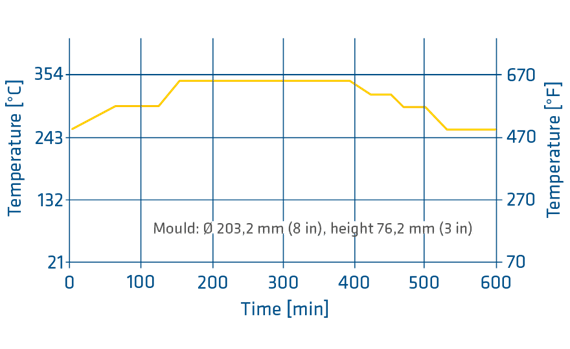 A suitable release agent is recommended. Before filling the mold, the powder must be dried to eliminate the equilibrium moisture. Drying can be done at 100 °C (219 °F) over 2 hours for a 1.8 kg (4 lb.) loading. At the filling step, the mold should be preheated to 250 °C (480 °F) and the powder should be transferred directly out of the oven into the mold. The first compression up to 17 MPa (2,500 psi) should remove the air from the loading. After this step the heating starts with a ramp up to 300 °C (572 °F). At this temperature the first dwell time with 1 hour is necessary. Then the full pressure of 35 MPa (5,000 psi) is applied and the ramp up to 340 °C (647 °F) starts.