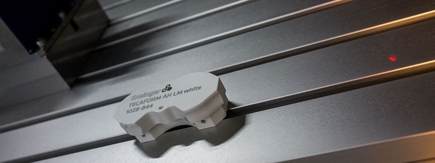 No todos los plásticos de alto rendimiento son intrínsecamente capaces de ser marcados con láser. Por ejemplo, el POM (acetal) y la poliamida PA no modificados no suelen mostrar ningún cambio de color al marcar con un láser Nd:YAG. Ensinger ofrece una amplia gama de plásticos aptos para el marcado con láser, como por ejemplo TECAFORM AH LM white, TECASON P MT y TECAPEEK natural. Marcar con láser el POM, es a menudo un reto, por lo que nuestro TECAFORM AH LM white ha sido modificado con un aditivo láser.