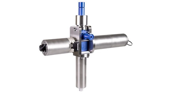 ワクチンやその他のバイオ医薬品の製造では、品質管理が極めて重要です。 特殊プラスチック(青)で作られた使い捨てセルは、測定センサーと液体の間の接触面を形成します。(写真提供:オプテック社)
