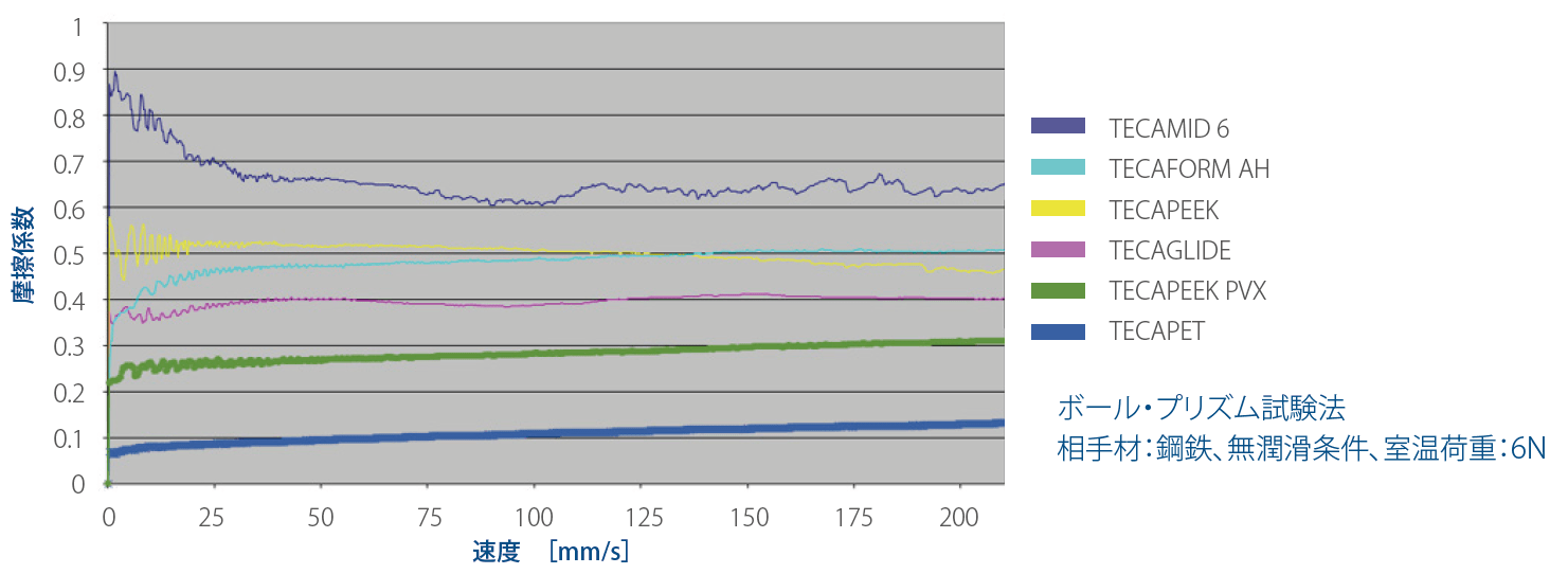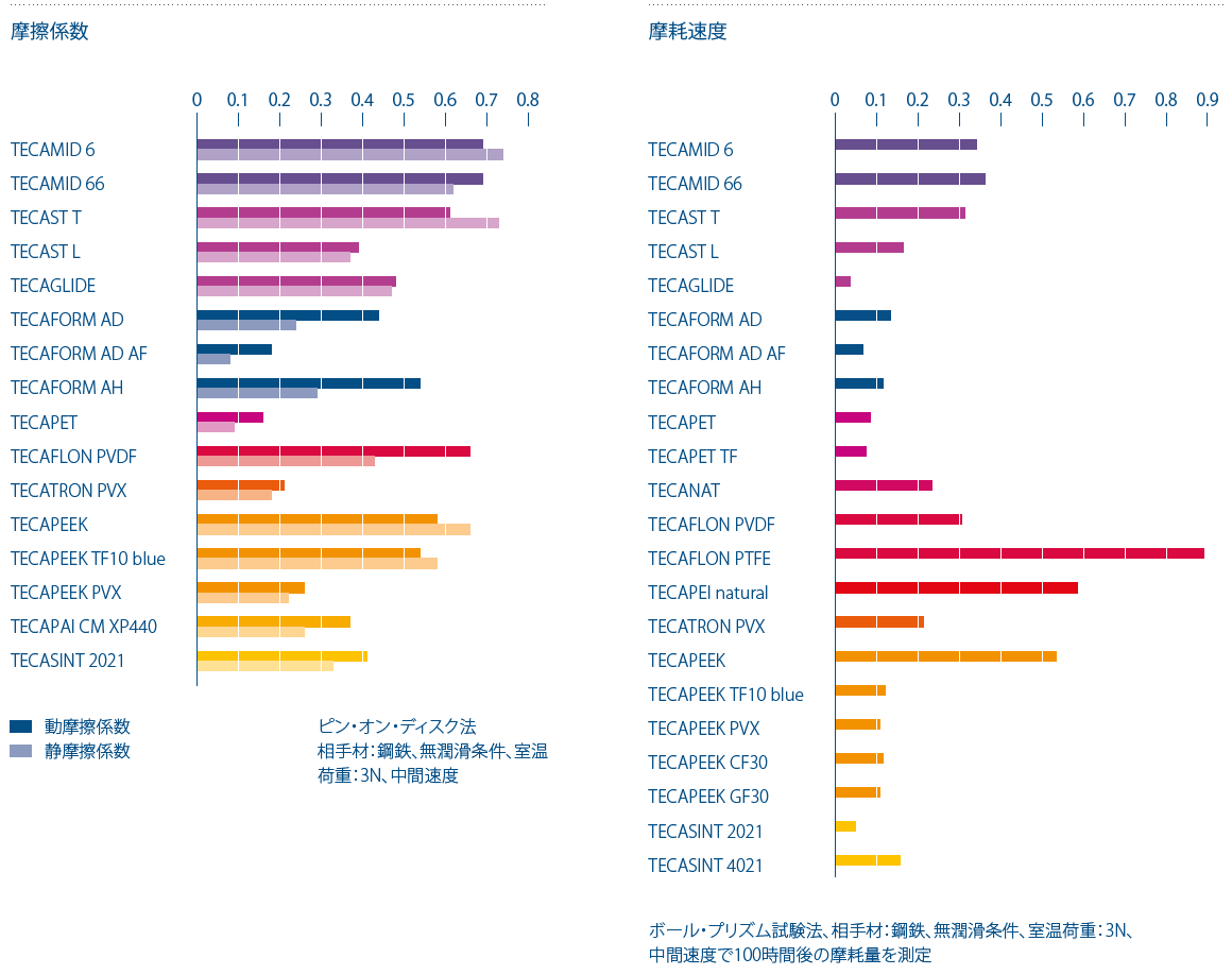 一般的には、超高分子量ポリエチレン(UHMWPE)やPTFE樹脂は最も低い摩擦係数を持つことで知られています。低摩擦係数に加え、強度や耐摩耗性が必要とされている用途には、ナイロン、POM、PET、PEEKなどが幅広く実績を持っています。下記のデータではPA6樹脂(TECAMID 6)、POM-C樹脂(TECAFORM AH)、PET 樹脂(TECAPET)、PEEK樹脂(TECAPEEK)、摺動性PA6C樹脂(TECAGLIDE)、摺動性PEEK樹脂(TECAPEEK PVX)の摩擦係数を比較しています。
