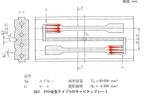プラスチック製品の異方性(方向により特性が変化すること)の原因は、樹脂と添加剤の配向です。図に示したのは、JISの引張試験片の金型図面です。射出成形では赤矢印で示した方向に樹脂が流動し、同じ方向に樹脂と添加剤が配向します。試験時の力かがかかる方向に補強されるため、良好な物性値を得ることが出来ます。基本的に、物性値が良くなる方向に配向した試験片が得られるようにデザインされています。