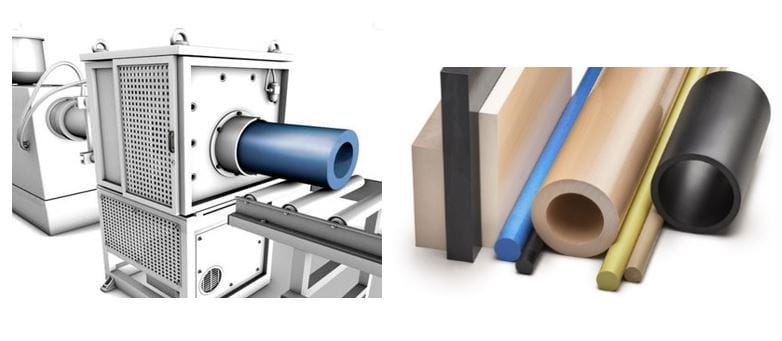 押出成形という製造方法は、切削加工用に供されるブロック状のプラスチック素材の製造やレールなどの異形押出材の生産に適した、成形方法です。