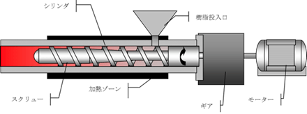 シリンダーと称される筒の中にスクリューがあり、モーターの回転をギアにより回転速度を調整してスクリュー を回転させます。原料樹脂を樹脂投入口に投入し、スクリューの回転により前方へと送られていきます。 樹脂が前方に送られていく過程で、シリンダー外部から加熱がなされ、樹脂が溶融していきます。同時に スクリューとシリンダーの空隙が徐々に狭くなり、樹脂が圧縮されてより溶融しやすくなります。スクリューの先端部では、溶融した樹脂が均一になるように混練がなされ、スクリューを通過した溶融樹脂は均一な状態で、金型へと送られます。