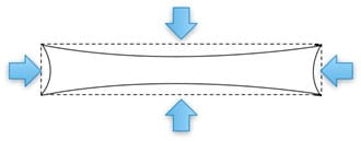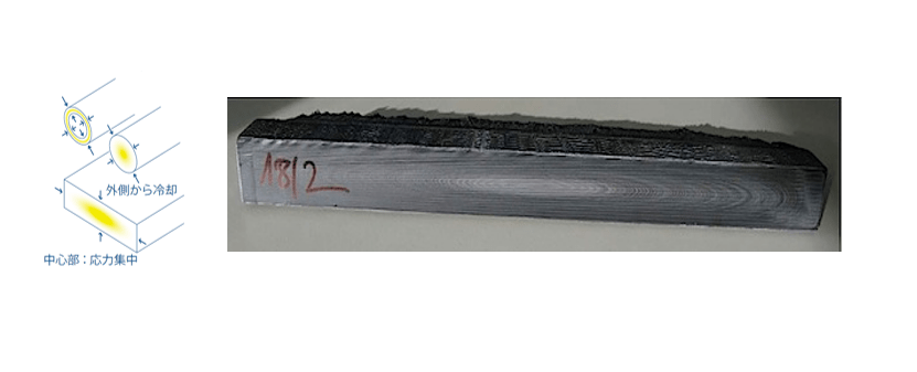 外側が完全に冷却され、固化すると、内側にヒケる様な変形は起きなくなります。しかし、中心部が固化する過程では、今度は逆に外側に引っ張られる方向に収縮する力が加わります。