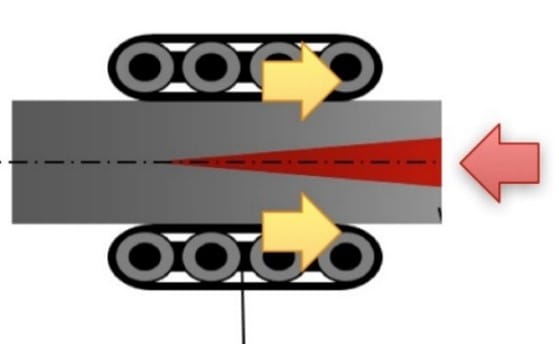固化した成形品の出口には、引き取り装置が設置されていて、押出方向とは逆向きの負荷を加えてます。