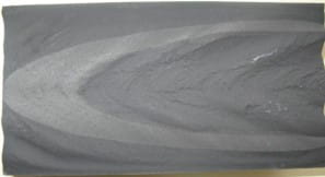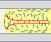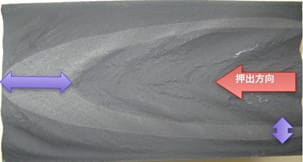 模式図にあるように、固化した灰色の部分は押出機から離れるにつれて厚くなっていきます。写真で見られる色の薄い部分は、右側の上と下では幅が薄く、左側の流動先端では幅が厚くなっています。