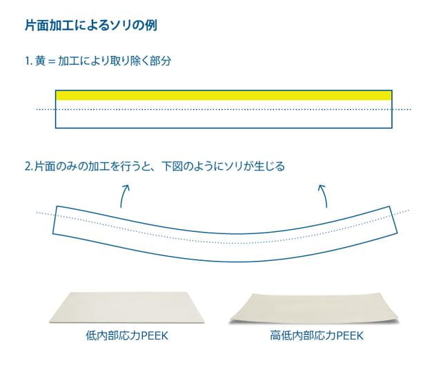 溶けた状態の樹脂が急激に冷却されて固化すると、内部に歪みを抱えた状態となり、切削加工性の悪い素材となります。