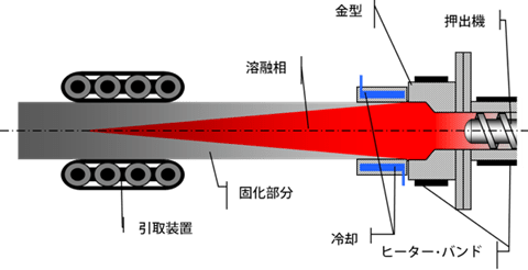 押出機により、均一状態に溶融・混合された樹脂は、金型により外側の形状が決定され、外側から冷却が進行し、外側から固化が始まります。