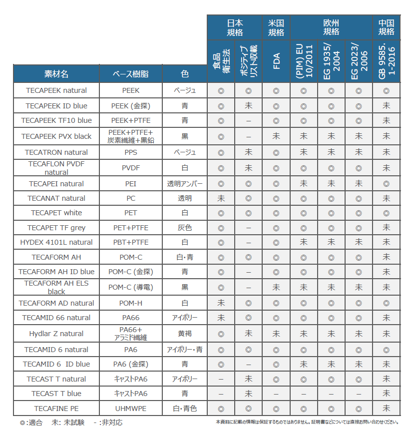 FDA、PIM、食品衛生法などの食品規格がありますが、エンズィンガーのプラスチックは多くのグレードで対応しています。