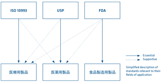 医療用途にプラスチック素材を検討する場合は、その対象となる製品と用途に応じて、以下に述べるそれぞれの規格を参照し、素材選択と製品の安全性を評価するにあたっての貴重な補足情報となります。