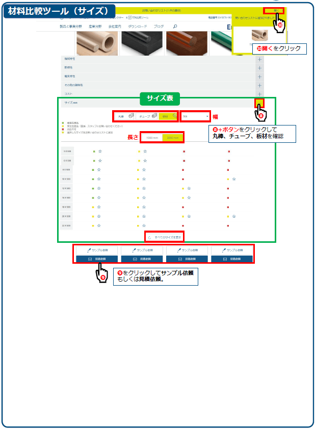 ・素材ごとの細かい物性の違いを確認でき、サンプル・見積依頼が可能