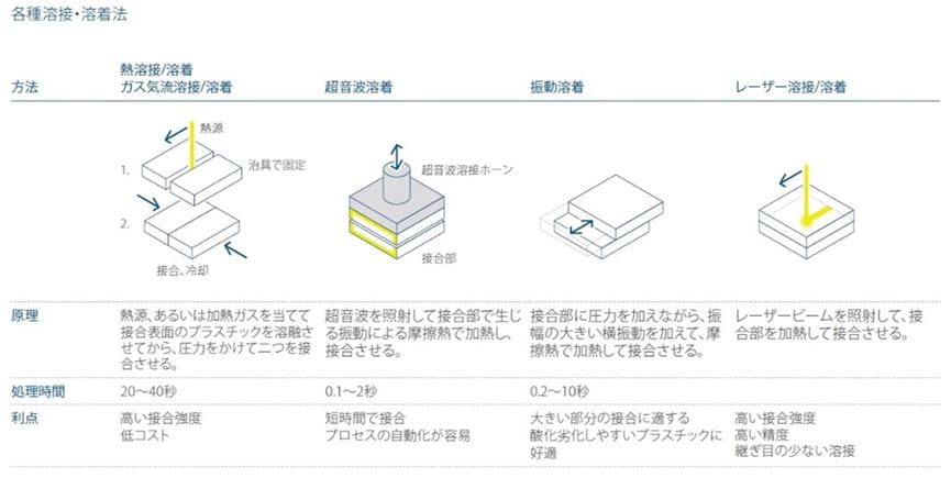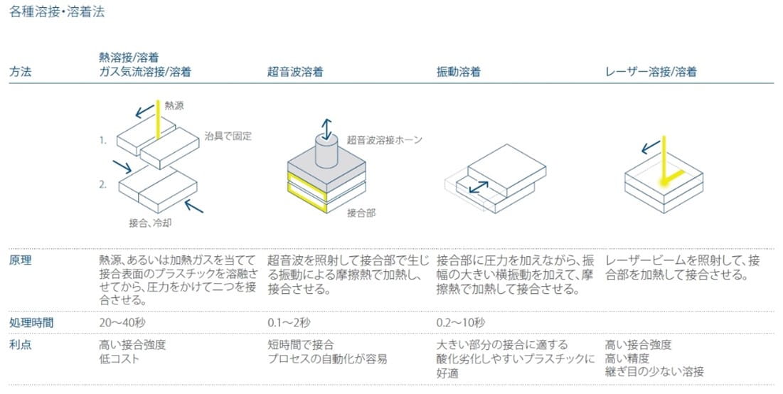これまでの知見では、ホットプレート、摩擦・振動、超音波による溶着方法で有効な結果が得られています。