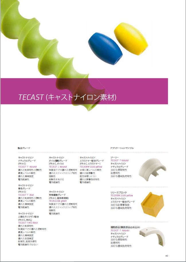 切削加工用素材としてPA6C樹脂(化学名:6ナイロン、キャストナイロンポリアミド樹脂)の板と丸棒、チューブを製造しています。金型にナイロンモノマー(原料:カプロラクタム)を注入して重合する、キャスト成形にて製造しています。キャストナイロンは射出成形や 押出成形の6ナイロンよりも、高い結晶化度、分子量、機械強度、靱性の特徴があります。オイル、固体潤滑剤、熱安定剤などの添加剤を使用することで、特定の用途に合わせて調整することもでき、幅広い用途で使用することができます。