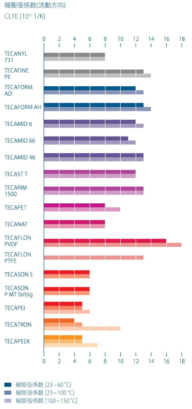 プラスチックは、その化学構造に起因して、金属よりもはるかに大きな線膨張係数を有します。線膨張係数は、以下の場合に考慮する必要があります。