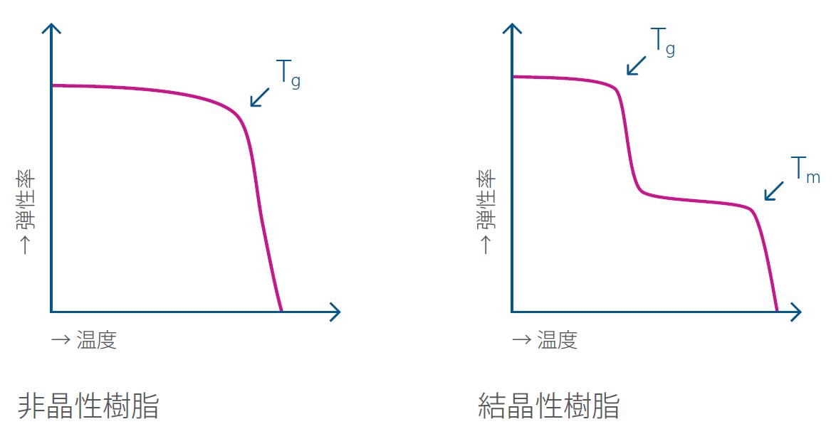 プラスチックを構成する高分子が、「ガラス」のように硬いが脆さのある状態から「水あめ」のように柔軟性がありゴム様の粘性を有する状態へと変化する温度のことをいいます。横軸に温度、縦軸にプラスチックの弾性率をとって、プラスチックの温度特性をプロットしたのが、次の二つのグラフです。左側が非晶性樹脂、右側が結晶性樹脂の例になります。