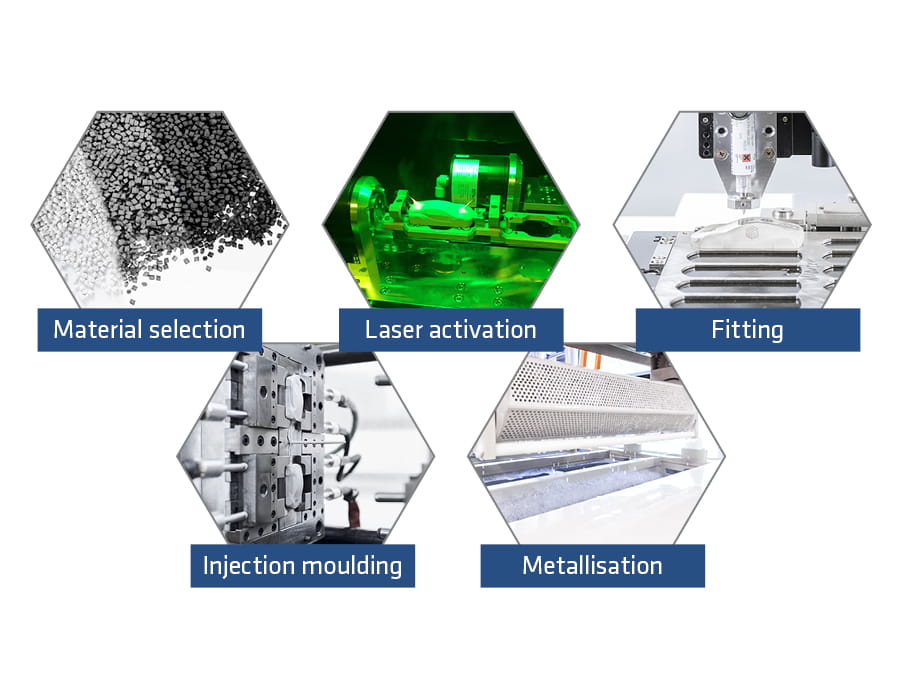 所需的部件首先由这种材料通过塑料注射成型生产。然后用激光束处理提供导体结构的区域,然后激活添加剂。